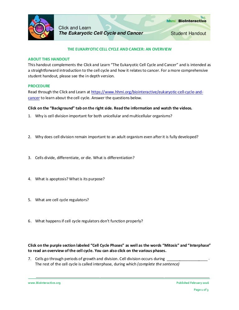 Cellcycle Worksheet 1 Click And Learn The Eukaryotic Cell Cycle And Cancer Student Handout The Eukaryotic Cell Cycle And Cancer In Depth About Course Hero